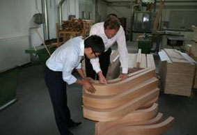 接著,在總裁的陪同下參觀了博蘭斯勒工廠,首先大師經(jīng)過(guò) 的是木材加工制作間。從木材的存放到干燥、穩(wěn)定處理再到成形; 最后形成我們博蘭斯勒獨(dú)一無(wú)二的背架、音板及外殼。博蘭斯勒共 鳴弦專(zhuān)利系統(tǒng)、獨(dú)立掛弦等精湛的技術(shù)令大師豎起了大拇指,并放 心的將屬于自己獨(dú)一無(wú)二的鋼琴交給博蘭斯勒去制作。
